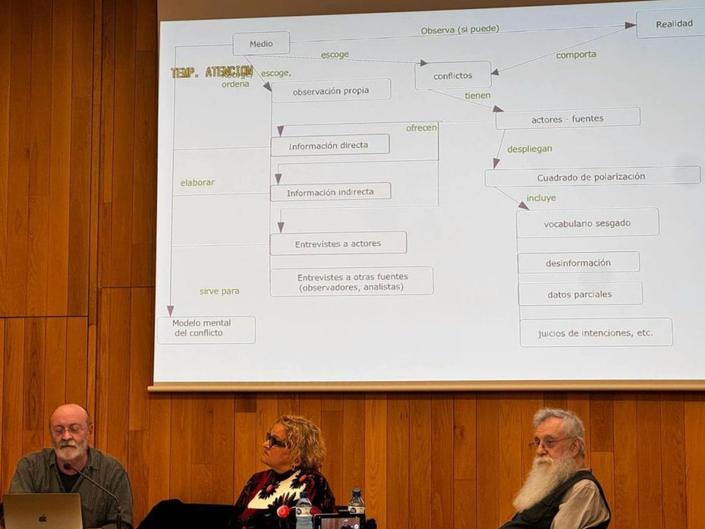 A continuación, el profesor Xavier Giró explicó qué la idea de neutralidad en los medios de comunicación resulta irreal, ya que el periodismo opera necesariamente desde marcos interpretativos condicionados por decisiones que implican criterios, desde la selección de los hechos noticiables, hasta el enfoque con el que se presentan, en el que también influyen las voces de los bandos en conflicto y de otras fuentes, como expertos y testigos, que también tienen su visión. Todo ello combinado con datos parciales de actores que despliegan lo que se denomina el “cuadrado de polarización ideológica”, donde cada parte maximiza sus virtudes y minimiza las del adversario, al tiempo que reduce sus propios defectos y amplifica los del contrario.